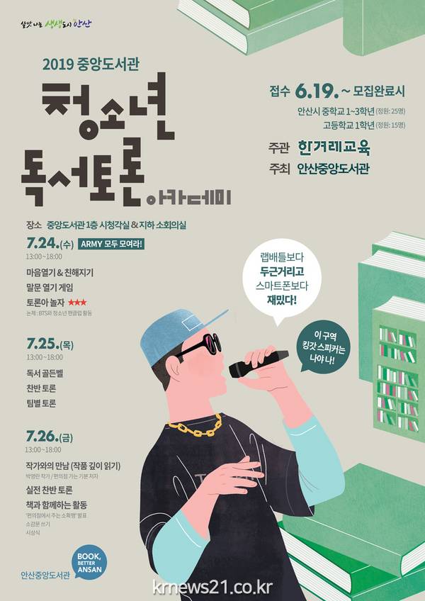 3일간의 독서토론 아카데미는 안산시 관내 중·고등학교를 통해 지난달 19일부터 선착순으로 접수받고 있다. 자세한 사항은 중앙도서관 홈페이지(lib.ansan.go.kr) 공지사항을 참조하거나 전화(031-481-3865)로 문의하면 된다.