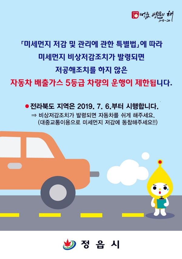 정읍시에 따르면 지난해 12월 말 기준으로 정읍에 등록된 배출가스 5등급 자동차는 1만859대로 전체 등록 차량의 약 19%에 이른다. 실제 운행제한이 시작되면 크고 작은 혼란도 불가피할 것으로 전망된다.