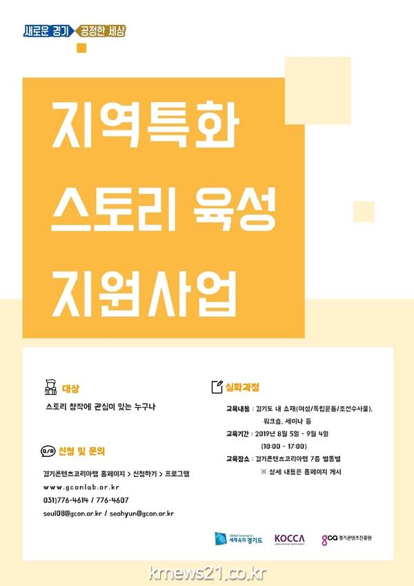 경기콘텐츠진흥원(이사장 김경표, 이하 진흥원)은 오는 7월 28일까지 경기도 기반의 이야기 발굴을 위한 ‘지역특화 스토리 육성 지원 사업’ 심화 과정 참가자를 모집한다.