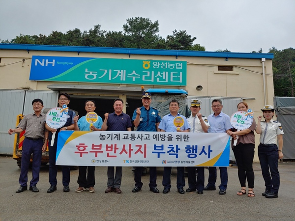 안성경찰서(서장 김동락)는 지난 24일 11시 양성면사무소, 양성농협 농기계 수리센터에서 한국교통안전공단, 안성시 농업기술센터와 합동으로 농기계 교통사고 예방을 위해 ‘농기계 후부 반사지 부착 캠페인’ 운동을 펼쳤다.