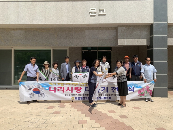 바르게살기운동 동두천시협의회(회장 배용순)는 지난 2일 가정용 태극기 500개를 동두천 일신건영휴먼빌 2차 아파트 관리사무소에 전달하며, 광복절에 주민들이 태극기 달기에 적극 동참해 줄 것을 당부하였다.