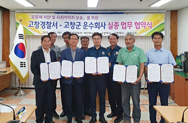 고창경찰서 서장(박정환)는 20일(화) 고창경찰서 2층 소회의실에서 고창관내 운수회사인 ㈜대한고속, 개인택시조합, (유)고창택시, (유)신흥택시와 실종등 「공동체치안 및 사회적약자보호」를 위한 실종 등 대응강화 업무협약(MOU)을 체결하였다.