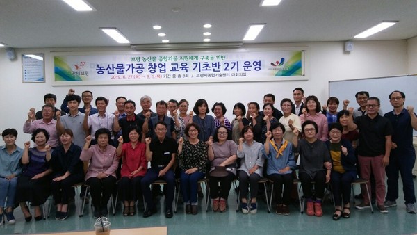 ▲ 농산물가공 창업 교육 수료식 장면보령시는 지난 5일 농업기술센터 대회의실에서 농산물가공창업 희망 농업인, 기존창업자 등 50여 명이 참석한 가운데 농산물가공 창업 교육 기초반 2기 수료식을 갖고 수료생 41명을 배출했다.