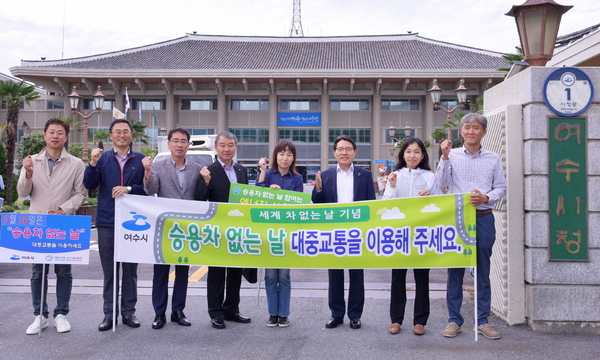 ▲ 권오봉 여수시장이 ‘세계 차 없는 날’을 이틀 앞둔 20일 오전 여수시청 정문에서 대중교통 이용 캠페인을 펼쳤다. 이날 권 시장은 시전동 자택에서 여수시청까지 버스를 이용해 출근하며 시민들과 소통했다.