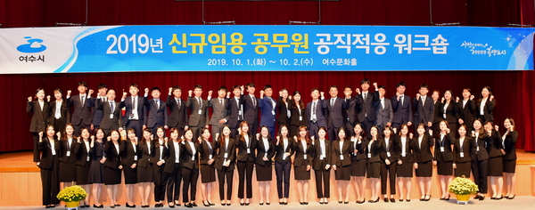 ▲ 지난 1일 여수문화홀에서 2019년 여수시 신규 임용 공무원 108명이 공직적응 워크숍’을 갖고 힘찬 첫발을 내디뎠다. 이날 새내기 공무원들은 직무교육과 안보교육, 소양교육을 받았다. 시 관계자는 “신규 공무원의 공직 적응력을 높이기 위해 워크숍을 추진하게 됐다”고 말했다.