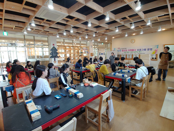 ▲ 자원봉사 프로그램중인 청소년들구례군(군수 김순호)은 지난 19일부터 20일까지 2일간 구례목재문화체험장에서 관내