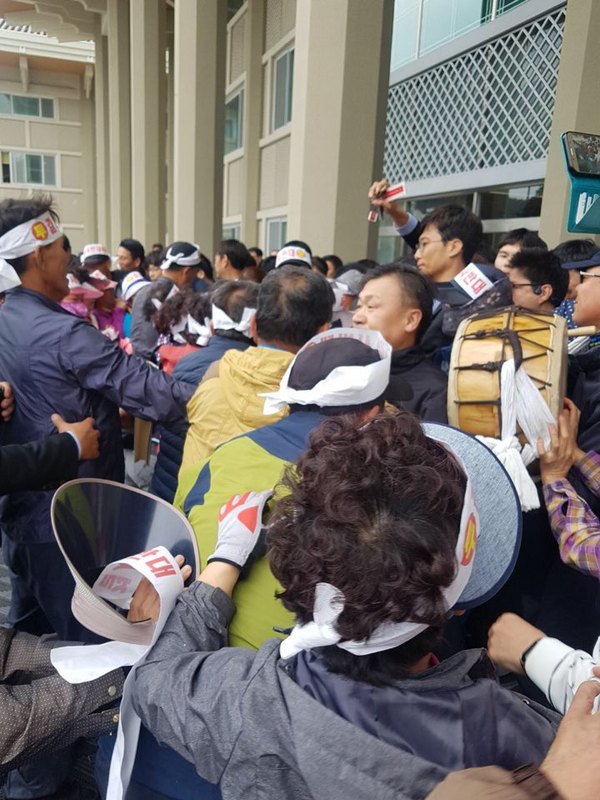 한국토지주택공사(LH)가 전남여수시 만흥지구에 추진중인 공공지원 임대주택 조성사업에 반대하는 주민들이 23일 오후 2시경 여수시청 입구를 시도하다 정문을 지키는 시청공무원 100명과으 몸싸움이 있었다.