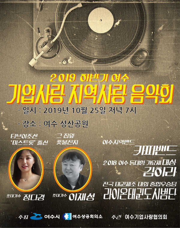 여수시는 오는 25일 저녁 7시 성산공원에서 2019년 하반기 기업사랑·지역사랑 음악회를 개최한다고 24일 밝혔다.