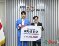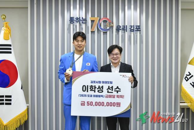 김포시(시장 김병수)는 17일 김포시청 소통실에서 2025 도쿄 데플림픽 태권도 +80kg급 금메달을 획득한 이학성 선수에게 포상금을 수여하며 그간의 노고를 격려했다. 이날 수여식에는 김병수 김포시장을 비롯해 교육문화국장, 체육과장, 지도자가 참석했으며 이학성 선수에게는 입상 포상금 5,000만원이 수여됐다. 데플림픽은 올림픽과 동등...