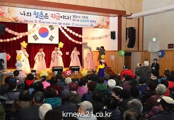‘나의 청춘은 지금이다’라는 주제로 진행된 이날 행사는 길놀이를 시작으로 에어로빅공연, 기념식, 축하공연, 종합발표회 순으로 진행됐으며, 종합발표회 1부는 보이스피싱 피해예방을 위한 연극공연, 2부는 경로당 운영혁신사업 축하공연, 가요교실, 실버에어로빅, 한국무용 등 각 사회교육 프로그램 및 동아리 11개 팀의 발표 시간을 가져 그간 갈고 닦은 실력을 마음껏 펼쳤다.