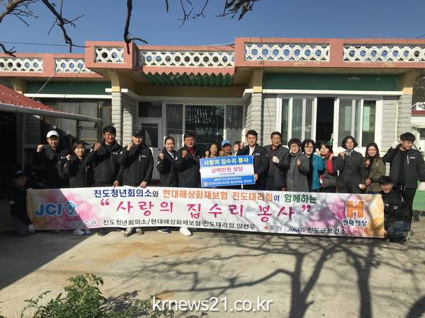 18일 진도군에 따르면 진도청년회의소와 현대해상화재보험 진도대리점이 함께 경제 형편이 어려운 고군면 넷째아 임신 다둥이 가정에 350만원 상당의 샤시, 도배, 장판 교체와 환경정화활동을 최근 실시했다.