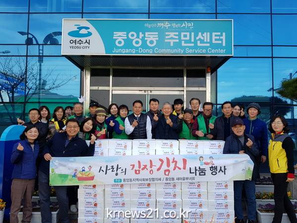 여수시 중앙동 지역사회보장협의체(민간위원장 서천석, 공공위원장 박상훈)가 지난 28일 중앙동 주민센터 주차장에서 김장김치 나눔 행사를 열었다.