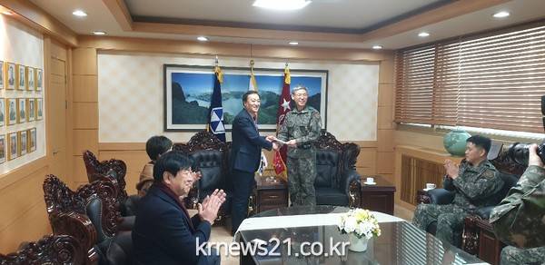 이에 백호현 이사장은 “군단장님과 참모, 처장님들의 따뜻한 환대에 감사드리며 특히 지난해 연천지역에 발생한 아프리카 돼지열병확진방지를 위해 군 장병들의 발빠른 방역활동과 초소 근무지원으로 확산방지를위해 도움을 주신 군단장님께 연천군민을 대신해 감사인사를 드린다.”고 말했다.