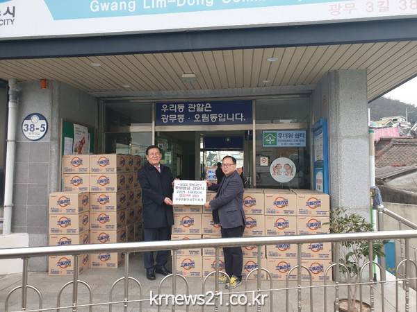 해산동에 위치한 ㈜우주종합건설은 작년 추석에도 라면 50box를 광림동에 후원한 데 이어, 어려운 대상자들에게 지속적인 나눔을 실천하여 주위의 귀감이 되고 있다.