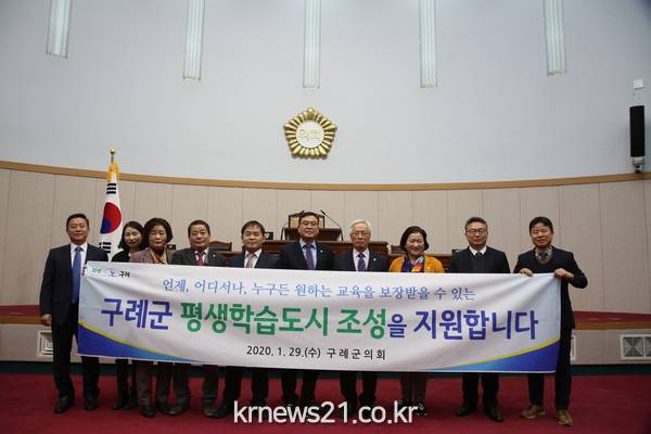 구례군의회(의장 김송식)가 29일 열린 제265회 임시회에서 노성원 의원의 대표발의로 구례군「평생학습도시 조성을 위한 결의안」을 채택하고 평생 학습도시 조성에 힘을 모으기로 결의했다고 밝혔다.