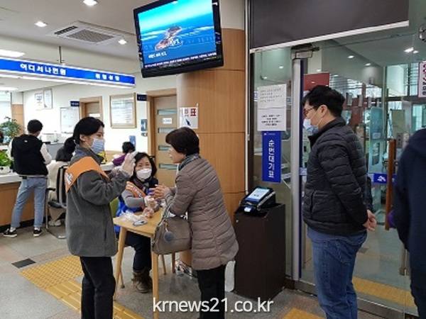민원인을 대상으로 체온측정, 손 소독 사용안내, 예방수칙 안내문 배포 등 주민들의