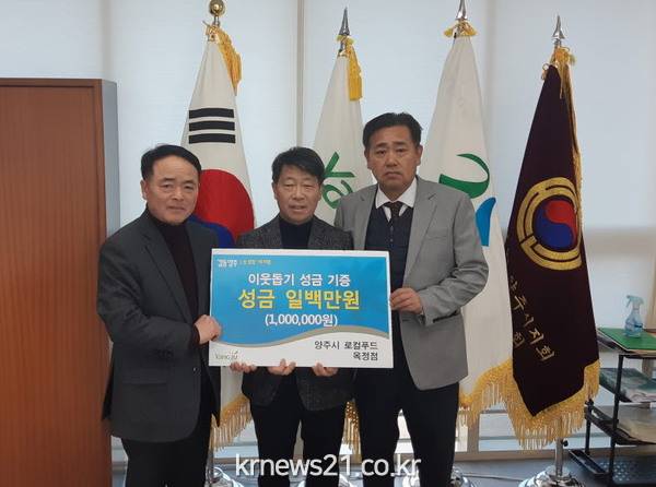 양주시 로컬푸드 옥정점(대표 임종혁)은 14일 회천4동 행정복지센터를 방문해 지역의 어려운 이웃에게 도움이 되길 바란다며 이웃돕기 성금 100만원을 기탁했다.