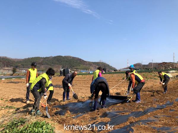 이날 새마을부녀회, 협의체 위원, 주민센터 직원 등 20여 명이 참여하여 멀칭작업에 힘을 보탰다.