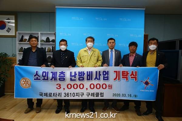국제로타리클럽 3610지구 구례클럽(회장 김준순)은 16일 구례군청을 방문해 코로나19 확산 방지를 위해 써달라며 성금 300만 원을 기탁했다.