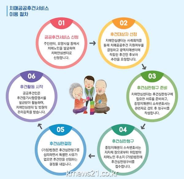 지원 절차는 사례회의를 통해 대상자를 선정하고 법원에 후견심판청구를 통해 후견인과 피후견인이 최종 결정되면 후견유형에 따라 치매환자의 통장 등 재산관리, 사회복지서비스 신청 및 의료서비스 이용 등 다양한 도움을 받게 된다.