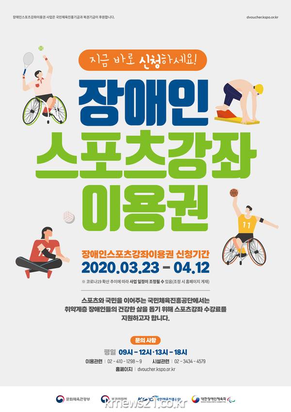 시 관계자는 “장애인스포츠강좌이용권 지원으로 저소득층 장애인의 스포츠 참여기회를 확대하여 체력향상과 건강 증진 도모하고 삶의 질 향상 및 사회적 소외감 해소를 통한 사회통합에 기여할 것”이라며 “코로나19로 인해 가급적 온라인신청을 권장한다.”고 말했다.