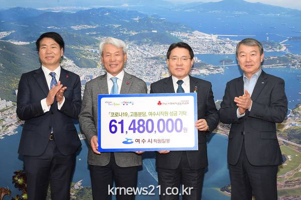 여수시는 24일 코로나19로 어려움을 겪고 있는 시민들의 고통을 분담하기 위해 부시장 이하 1700여 명의 급여 반납액으로 마련된 성금 6천148만 원을 전남사회복지공동모금회(노동일 회장)에 전달했다.