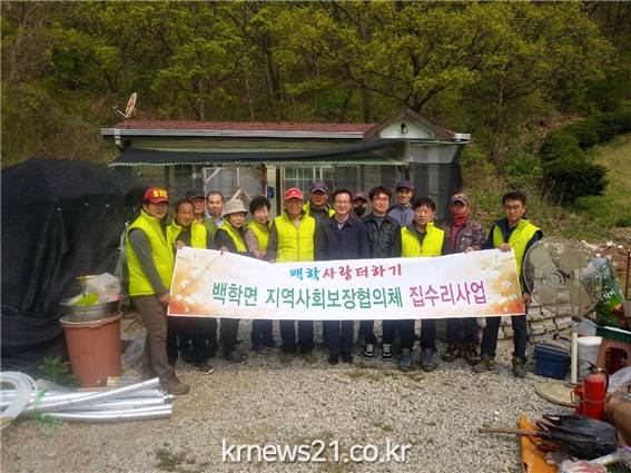 백학면 지역사회보장협의체 위원들은 4월29일부터 5일동안 지역에 거주하는 저소득 세대 집수리를 실시했다. 대상자는 간암수술을 받은 국민기초생활보장수급자로 일상생활의 어려움이 심해 노후된 주택수리는 엄두를 내지 못하는 상황이었으며 지역사회보장협의체 회의를 통해 노후된 주방을 교체 설치 하는 집수리가 진행됐다.
