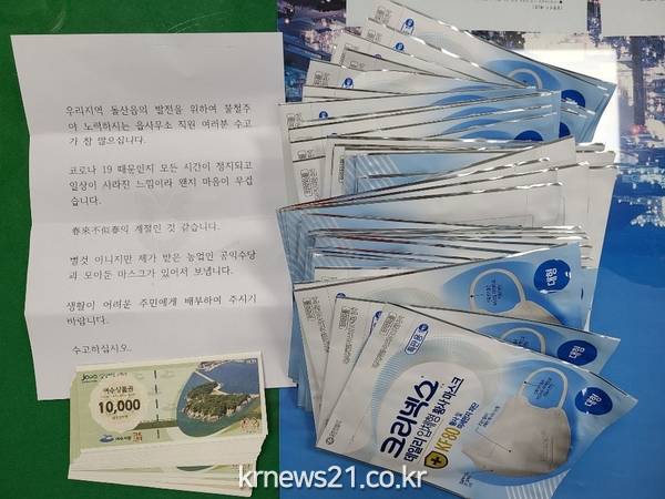 돌산읍(읍장 조용연)에 따르면 21일 익명의 기부자가 여수농협본점을 통해 상품권 60만원과 마스크 50개를 전달해 훈훈한 감동을 안겨줬다.
