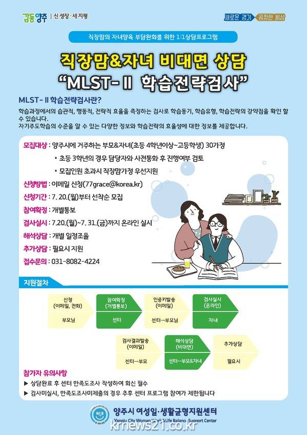 양주시 여성일·생활균형지원센터는 오는 20일부터 직장여성의 자녀양육 부담완화를 위한 자녀학습전략 상담프로그램 참여자를 선착순으로 모집한다고 밝혔다.
