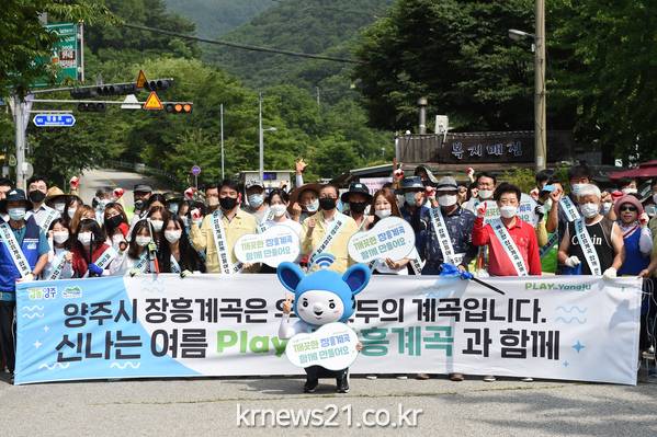 양주시(시장 이성호)는 17일 장흥계곡 하천 일대에서 조학수 부시장을 비롯한 장흥계곡 시민환원사업 TF추진단과 장흥면 상가연합회, 사회단체, 관계 공무원, 경동대 유아교육과 하람봉사단 등 100여명이 참여한 가운데 대대적인 환경정화 활동을 진행했다.