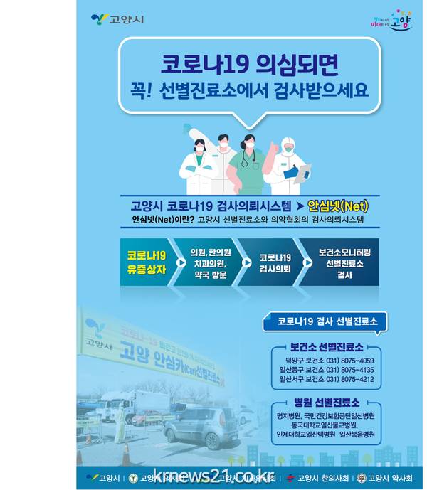 고양시 (시장 이재준)는 코로나19 지역감염 조기 대응을 위해 고양시 4개 의약협회와 선별진료소 간 ‘코로나19 고양 안심넷(Net)’을 구축해 운영한다고 21일 밝혔다.