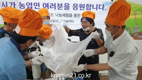 이날 고양시농업기술센터가 주관해 고양시농촌체험교육농장연구회 회원 20명을 대상으로 누구나 쉽고 재밌게 즐길 수 있는 치즈 낙농 치유 프로그램을 운영하고, 슬기롭게 코로나19를 극복할 수 있는 방안을 의논하는 자리를 가졌다.