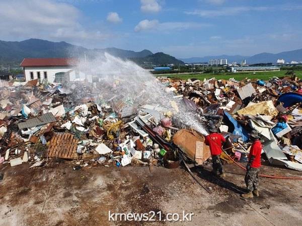 ▲ 8월 16일 해병대 1사단 31대대에서 쓰레기 임시 야적장에 대한 방역을 진행하고 있다구례군은 코로나19 예방을 위해 서울‧인천‧경기‧광주 자원봉사자 접수를 정중히 거절하고 있다.