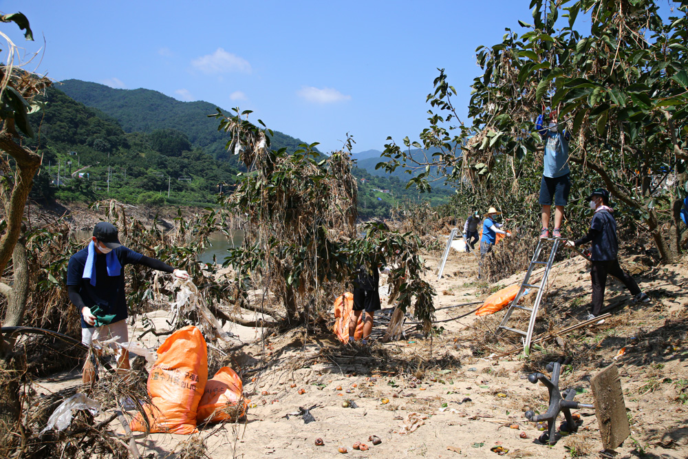 ▲ 구례읍 유곡마을 섬진강변 감나무밭에 걸린 폐기물 수거 작업을 자원봉사자들이 하고 있다~지난 8일 호우피해로 구례군은 전체 1만 3천 가구 중 10%에 달하는 1,188가구가 침수 피해를 입었다. 5일시장 등 상가 392동이 물에 잠겼다. 총 피해액은 1807억원으로 추정된다.