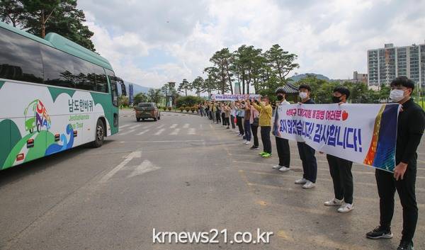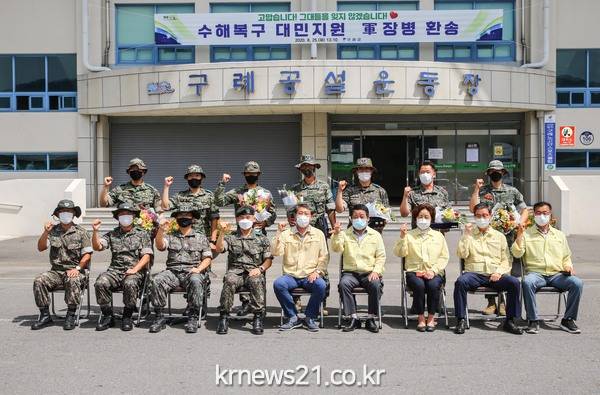 차량에 탑승한 장병들을 격려하기 위해 구례군청 직원들이 거리에 나와 격려 현수막을 펼치고 열렬히 환송했다. 사회적 거리두기 2단계로 인해 최소한의 인원만 참석했다.