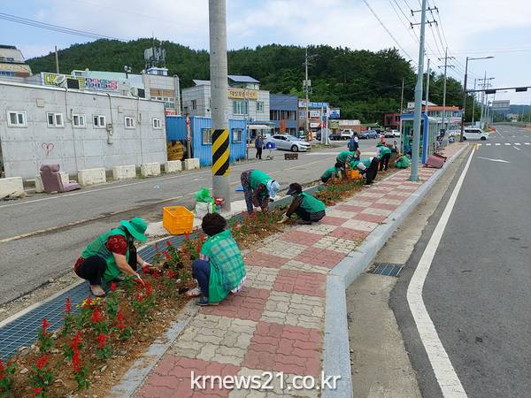 새마을회원, 이장, 마을주민, 면사무소 직원 등 40여 명이 참여해 다리 부근 약 100㎡ 부지에 김매기, 땅고르기, 상토뿌리기를 마친 후 메리골드, 사루비아 등 3개종 3,000여 본을 식재했다.