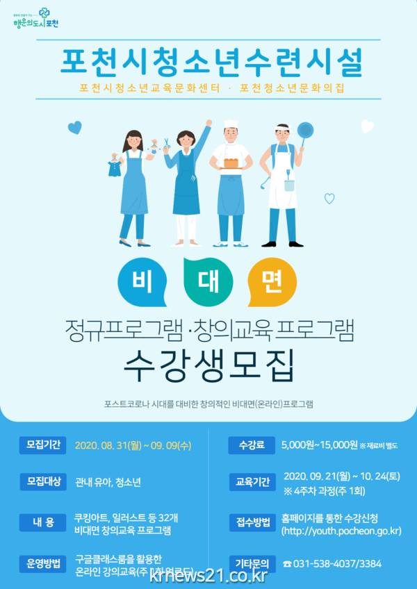 포천시 청소년수련시설(포천시청소년교육문화센터 및 포천청소년문화의집)은 포스트코로나 시대를 대비해 관내 청소년들을 대상으로 비대면 창의교육·정규프로그램을 운영한다.