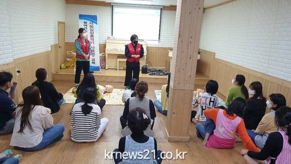 사)세계건강생활진흥연맹(조안순 총재)이 찾아가는 응급처치(심폐소생술) 및 자동심장충격기 사용법 교육을광주 북구 소재 은송어린이집 교직원 및 라예송 유치원 교사들을 대상으로 9월 22일 오후 6시~7시 30분까지 은송어린이집 강당에서 교육하였다.