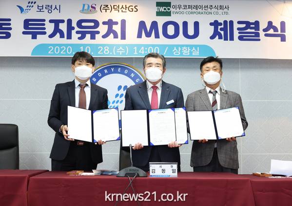 보령시는 28일 시청 상황실에서 김동일 시장과 박문수 ㈜덕산GS 대표, 이우정 이우코퍼레이션(주) 대표 등이 참석한 가운데 유망 중소기업 투자협약을 체결했다고 밝혔다.