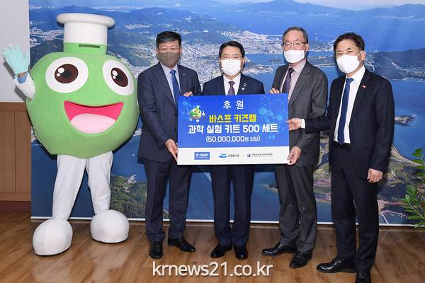 여수시에 따르면 16일 한국바스프(주) 김영률 대표이사가 여수시청을 찾아 권오봉 시장에게 바스프가 개발한 키즈랩 과학 실험키트 및 온라인 교육 프로그램을 후원하는 기증식을 가졌다고 밝혔다.