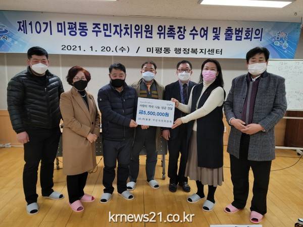 여수시 미평동 주민자치위원회(위원장 강형국)는 지난 20일 사랑의 떡국 나눔 성금 550만 원을 미평동 지역사회보장협의체(공동위원장 최재영)에 전달했다.