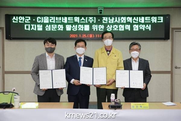 신안군(군수 박우량)은 2021년 1월 25일 ‘CJ올리브네트웍스’(대표이사 차인혁), ‘전남사회혁신네트워크’(이사장 정순남)와 함께 섬이 보유한 자원 및 자산을 수집·활용하여 섬의 가치를 극대화하고 디지털 섬 문화를 향상시키기 위해 다자간 상호협력(MOU)를 체결했다. 신안군청 보건소 대회의실에서 열린 이번 체결식에는 박우량 신안군수, CJ올리브네트웍스 차인혁 대표이사, 전남사회혁신네트워크 정순남 이사장을 비롯한 주요 관계자가 참석했다.