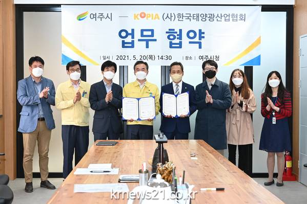 여주시와 한국태양광산업협회는 5월 20일 여주시장실에서 이항진 여주시장과 홍성민 협회장 등 관계자 8여명이 참석한 가운데 태양광 보급 활성화를 위한 업무 협약을 체결했다. 이번 협약은 여주시 시민참여형 태양광보급사업의 원활한 추진을 위하여 상호 정보 교류 사업 개발을 하며 나아가 2050 탄소중립 계획을 이행하고자 진행됐다. 여주시는 현재 주민에게 발전수익이 돌아가는 여주형 태양광 사업’을 추진하고 있으며 이와 연계하여 태양광 홍보 및 사후관리 교육을 통해 여주시민들의 태양광에너지 수용성을 높이는데 중점을 둘 계획이다. 여주시 관계자는 협업을 통해 6월부터 시작하는 여주시 에너지활동가양성 교육과정을 시작으로, 태양광의 원리와 사후관리에 관한 책자 및 동영상을 제작한 후 지역 내에 배포하여 주민에게 양질의 정보를 제공할 것이라고 밝혔다.