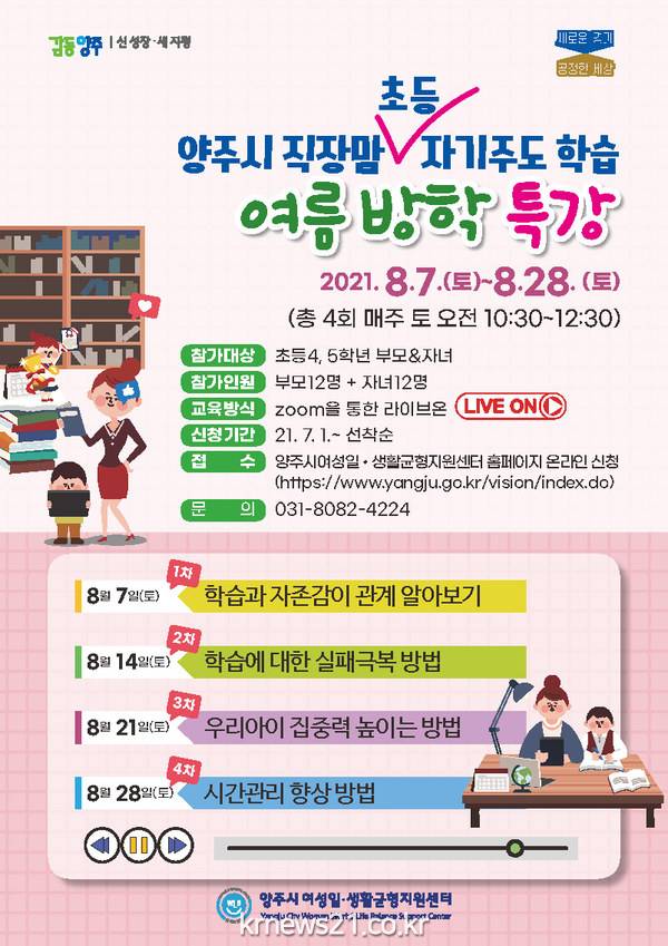 양주시(시장 이성호)는 오는 7월 1일부터 양주시여성일생활균형지원센터에서 운영하는 ‘제2기 직장맘 자녀학습 컨설팅’에 참여할 직장여성과 자녀를 선착순으로 모집한다.