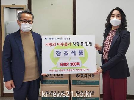도봉1동주민센터 박효진 동장은 “코로나19로 모두가 힘든 상황에서 지역사회를 위해 나눔을 실천하는 창조식품과, 서울지구제이씨특우회에 깊은 감사를 드린다. 보내주신 기부물품은 어려운 이웃의 겨울나기에 쓰일 수 있도록 잘 전달하도록 하겠다.”고 말했다.