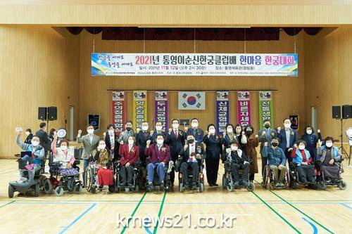 ▲ [사진제공 = 통영시]"2021년 통영이순신한궁클럽배 한마음 한궁대회”행사가 지난 11월 12일(금) 한국선원장애인협회 통영시지회(지회장 장재군) 주관으로 통영체육관에서 90여명이 한 자리에 모인 가운데 성황리에 개최되었다.