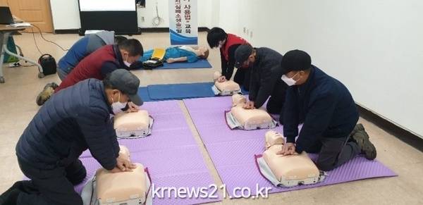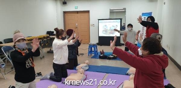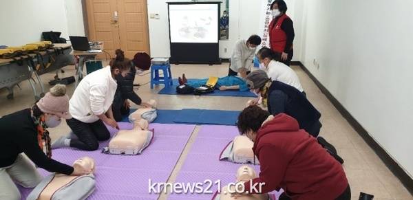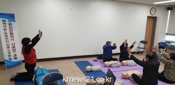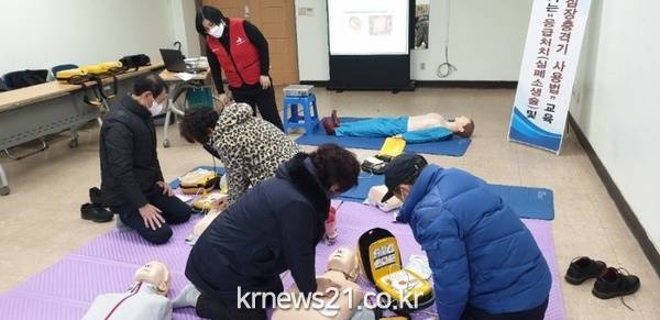 요청하여 2층 주민자치센터 회의실에서 응급처치 심폐소생술 및 자동심장충격기 사용법 교육을 실시하였다.