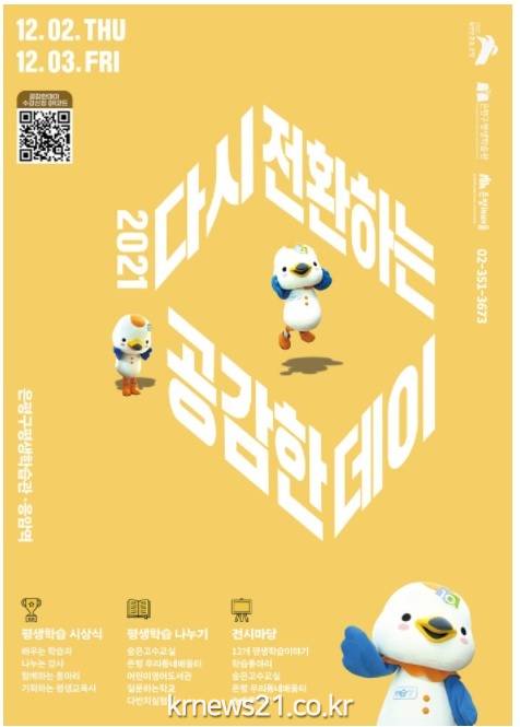 ▲ 사진=2021 다시 전환하는 공감한데이 포스터 / 은평구은평구(구청장 김미경) 은평구평생학습관(관장 이창식)은 12월 1일부터 3일까지 은평구평생학습관과 응암역 신사교 일대에서 ‘2021 다시 전환하는 공감한데이’를 개최한다. 이번 ‘공감한데이’는 위드코로나 시기에 맞춰 ‘다시 전환하는 평생학습도시 은평’을 디자인한다는 의미를 담고 있다.