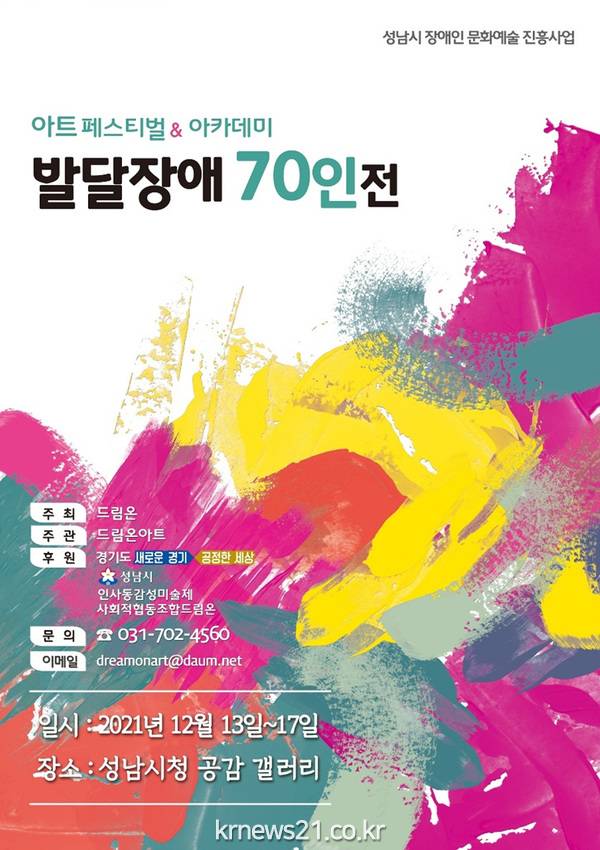 ▲ 사진=드림온아트발달장애인에게 문화예술을 전문으로 교육하는 드림온아트(대표 김서정)에서 "아트페스티벌 & 아카데미 발달장애 70인展"을 2021년 12월 13일(월) ~ 12월 17일(금)까지 성남시청 공감갤러리에서 진행 중에 있다. 성남시 장애인 문화예술진흥사업 일환으로 펼쳐지는 "발달장애 70인展"은 만 7세에서 50대 후반까지 발달장애를 가지고 있는 다양한 연령층에서 참가했다. 드림온아트는 미술, 음악, 무용 등을 눈높이에 맞춰 교육함으로써 치료를 통해 재능을 발굴하고 발전시켜 예술가로 활동하는 직업예술인으로 성장을 돕고있다.