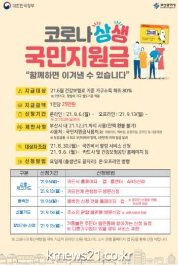코로나 상생 국민지원금(이하 국민지원금)은 코로나19로 인해 소득이 감소한 피해 계층의 생활안전망 확보를 위해 소득 하위 80% 가구를 대상으로 개인별 25만 원을 지원하는 사업이다. 12월 27일 기준, 부산지역 지급대상자 289만 3천 명 중 288만 1천여 명이 수령을 완료하여 지급률은 99.6%에 달한다.
